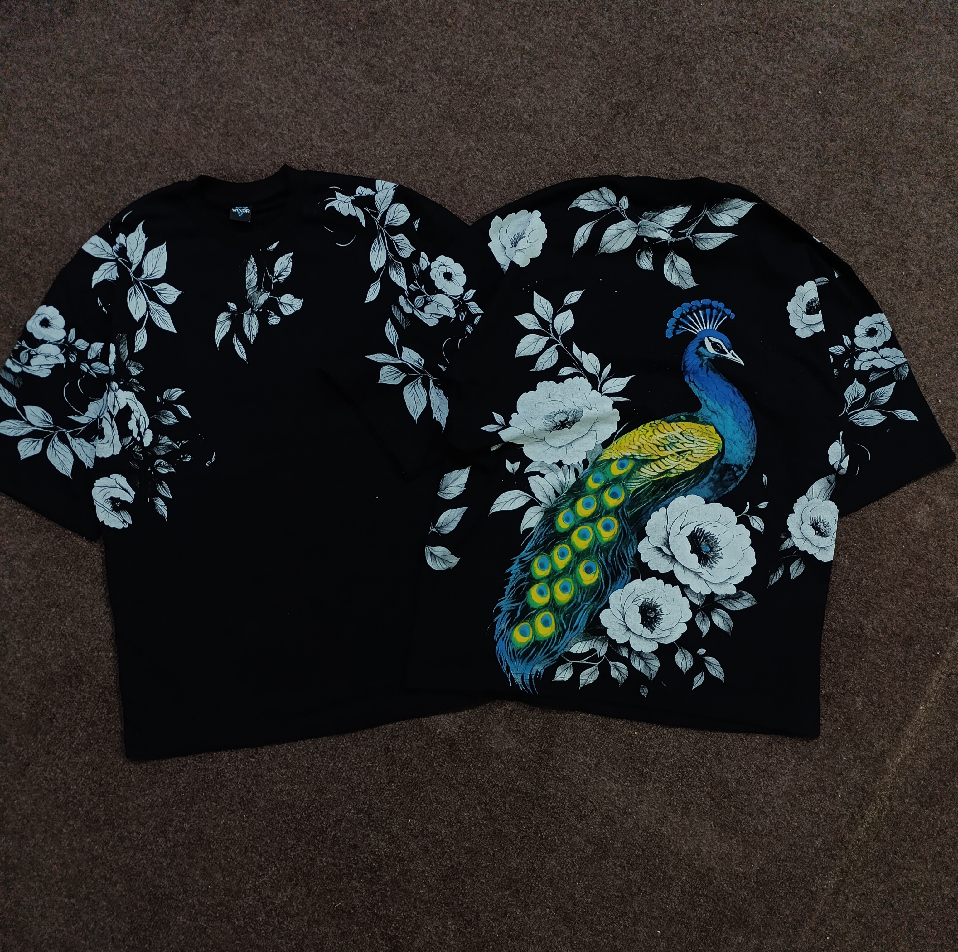 ناموجودتیشرت مردانه نگین دار ماکان قواره باکسی طرح طاووس
